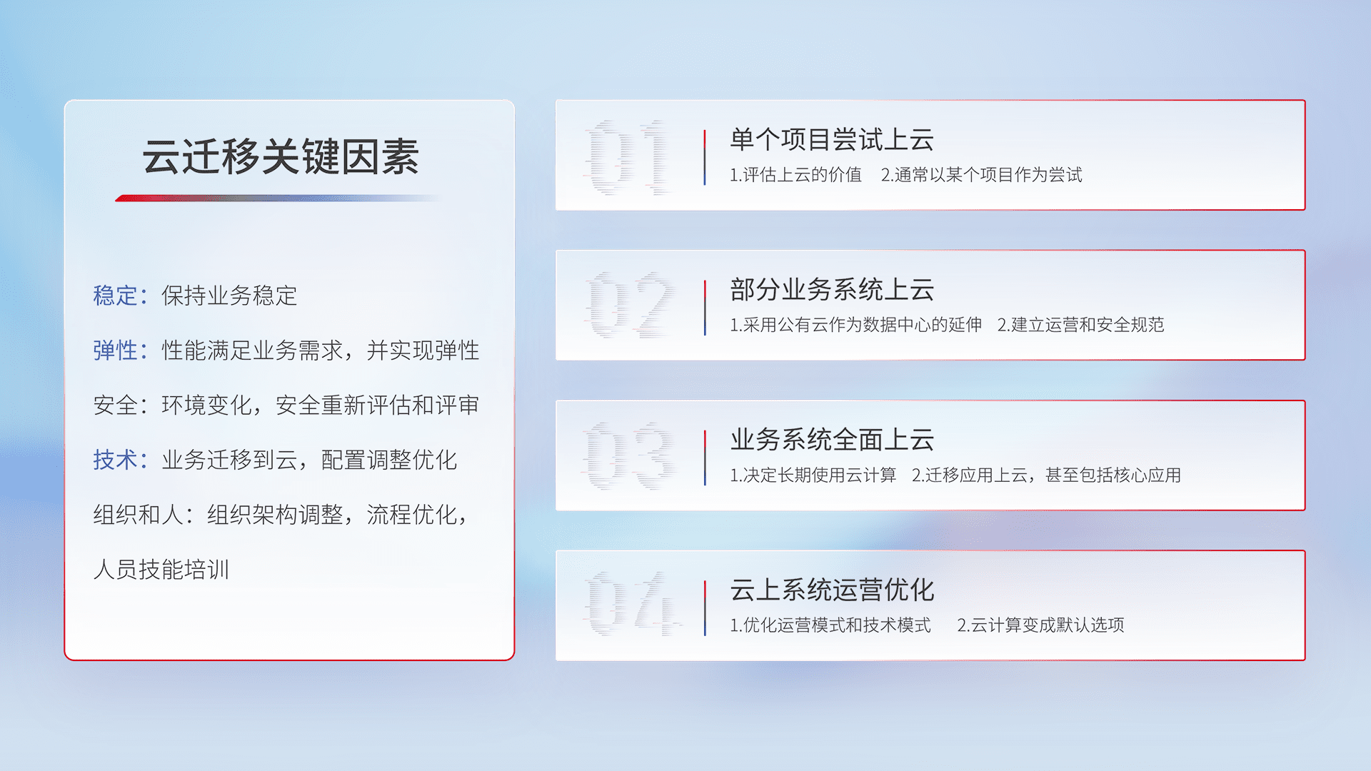 结合实际业务,,,,从规划设计、、、、云平台选型、、、、云原生改造、、数据迁移、、、、集成交付,,迁移全过程为客户识别最佳上云路径,,,,做好风险识别管理,,,设计网络架构、、、身份权限、、、、安全审计合规、、操作审计、、、日志审计、、、、监控告警策略、、、多站点容灾设计等,,对云上基础设施进行整体规划,,,提升IT治理水平,,,以满足弹性、、高可用、、、高性能的需求。。。。