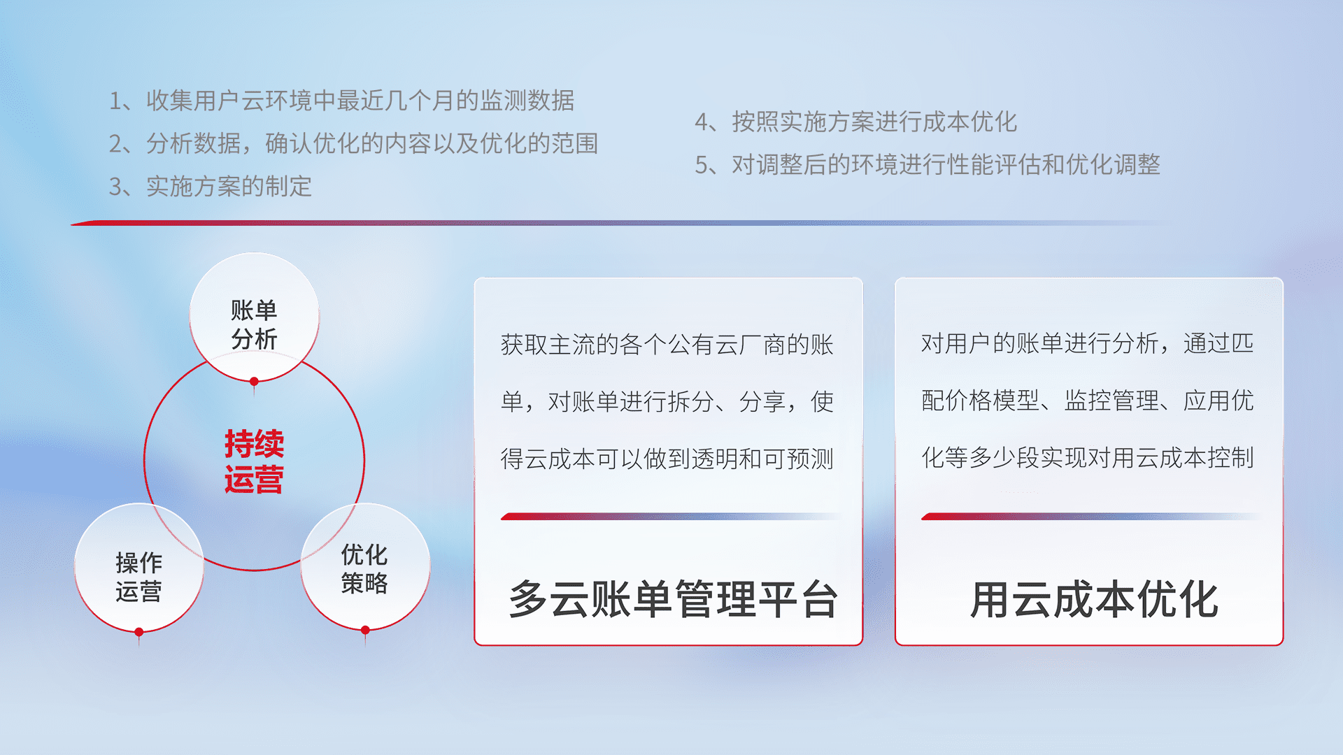 通过多云纳管,,以统一的资源数据模型把客户的云资源进行抽象和封装,,进而实现对多云资源的统一操作,,,,保障云资源管理的可靠性、、稳定性与可用性。。。量身定制化运维内容,,配置、、开发运维、、补丁管理、、、、备份、、监控、、、、认证和访问管理、、审计和日常巡检等,,,保障在用云过程中的可靠度,,稳定度以及高可用率。。。。